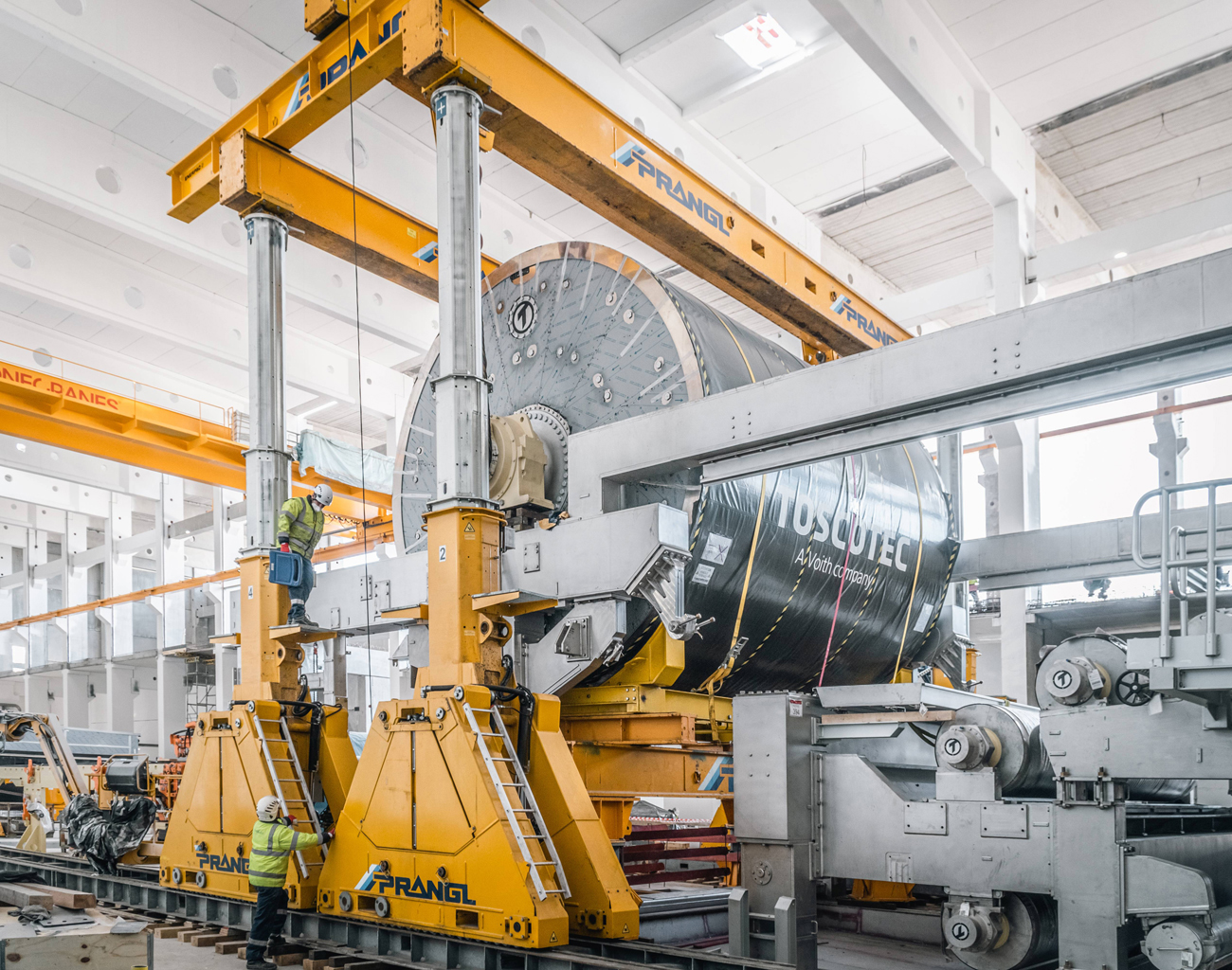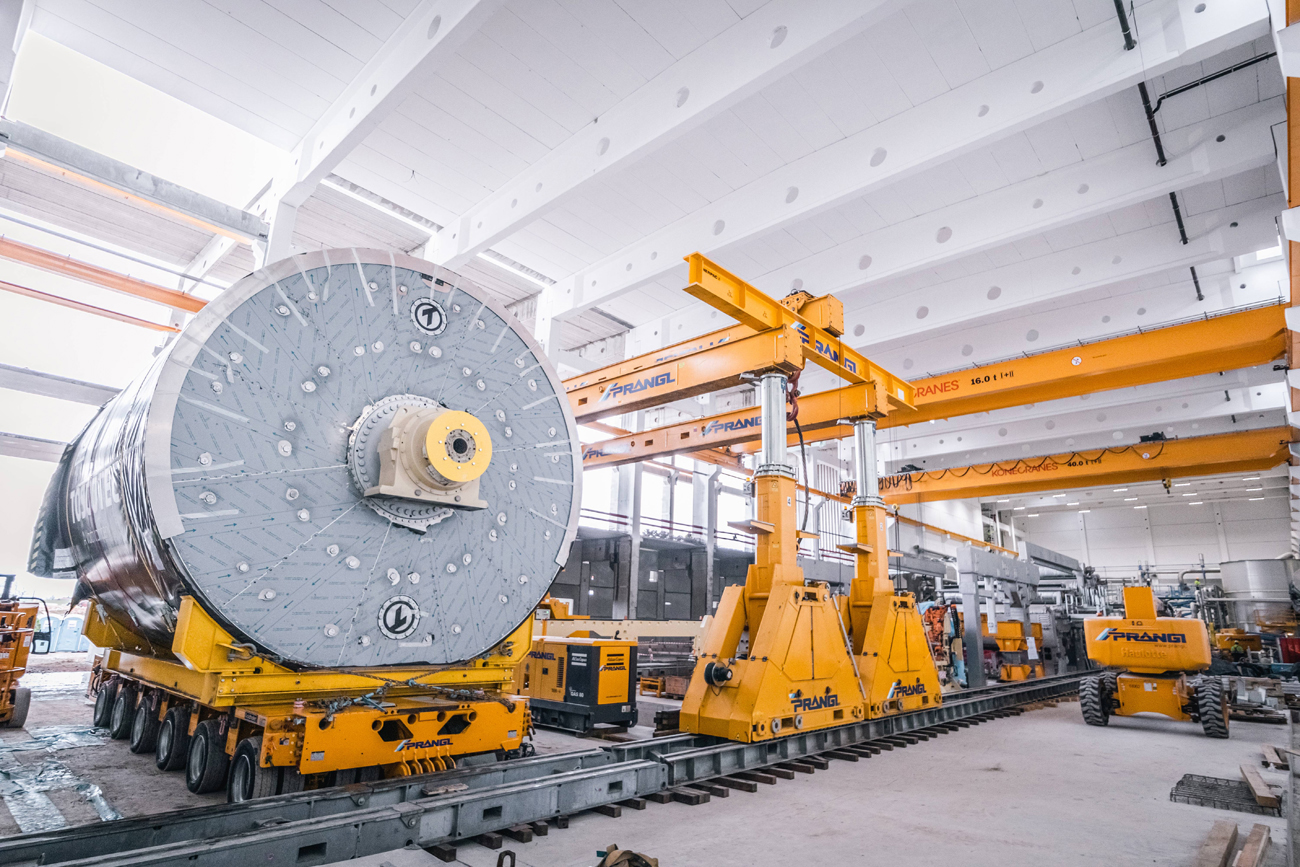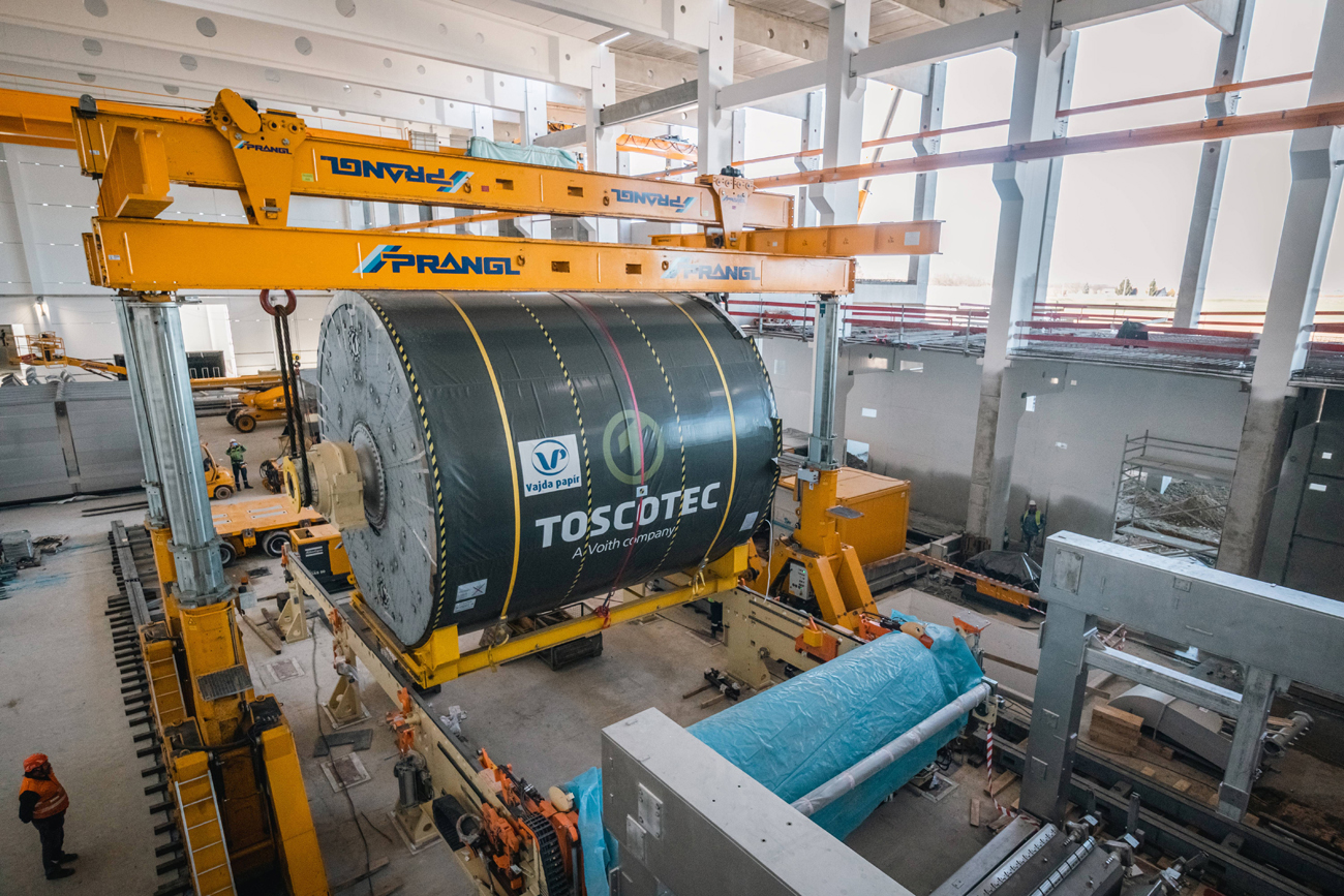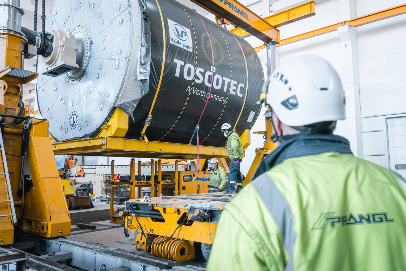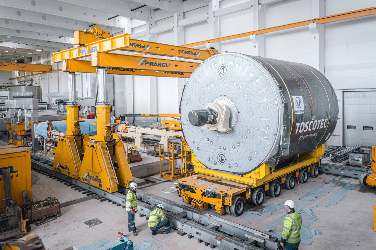 Für den Ausbau der Papierfabrik im ungarischen Dunaföldvár wurden Experten von Prangl hinzugezogen. Der 145 Tonnen schwere Yankee-Papiertrockenzylinder musste in die Halle gebracht und „gezogen“ werden – im wahrsten Sinne des Wortes, da aufgrund der vorbereiteten Installationen wenig Platz war.