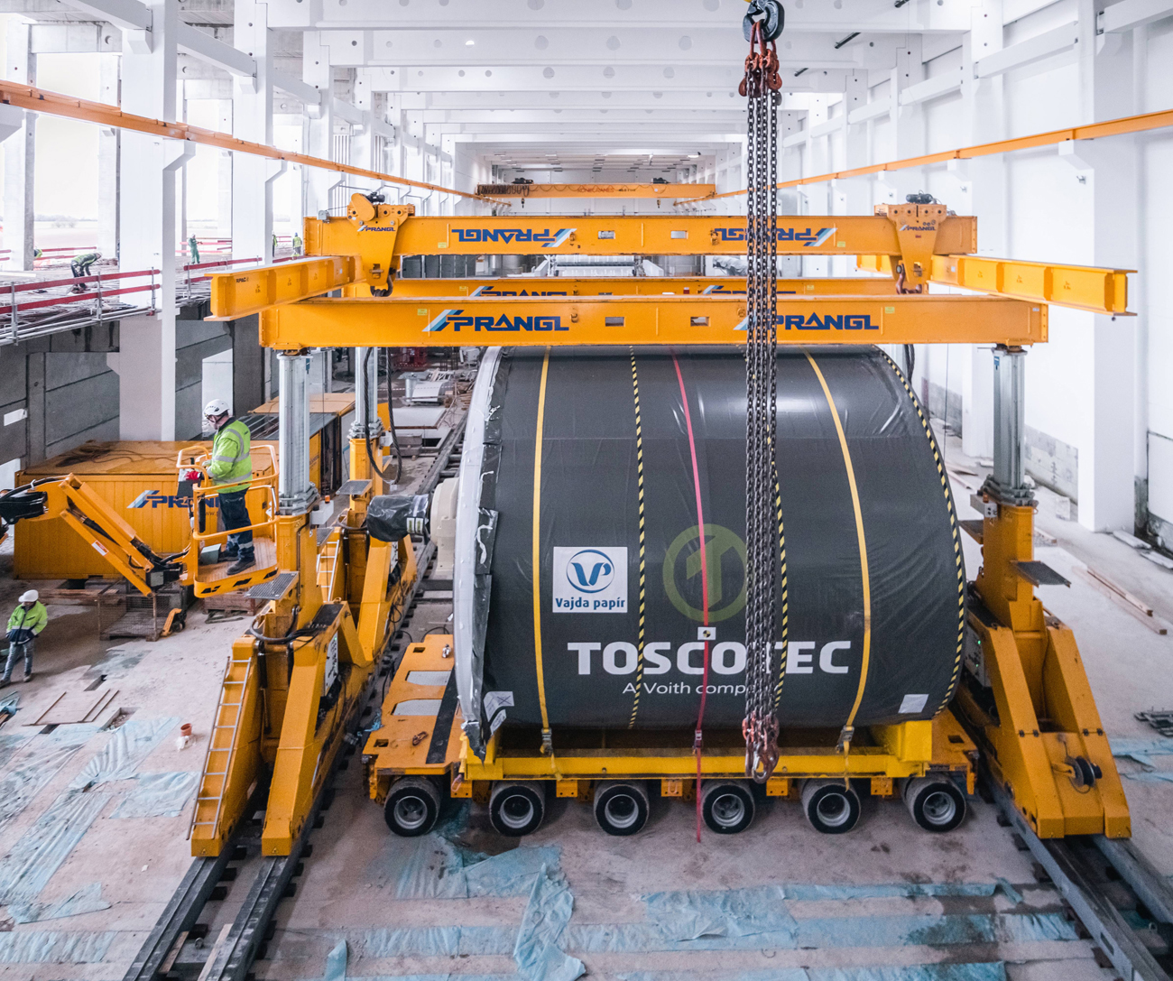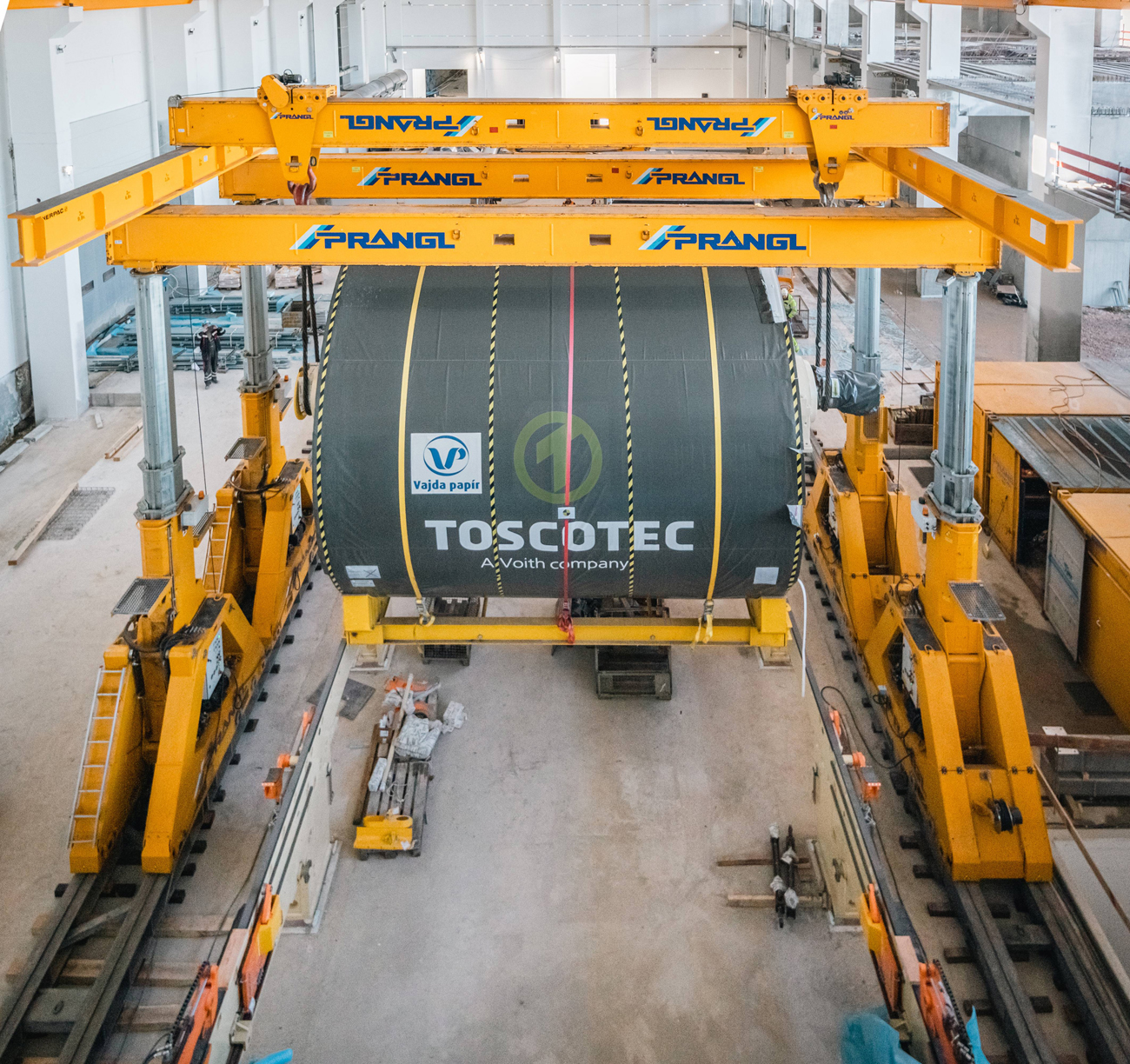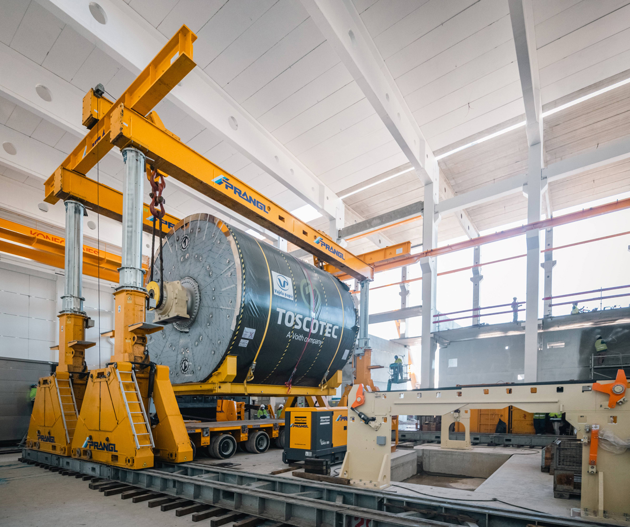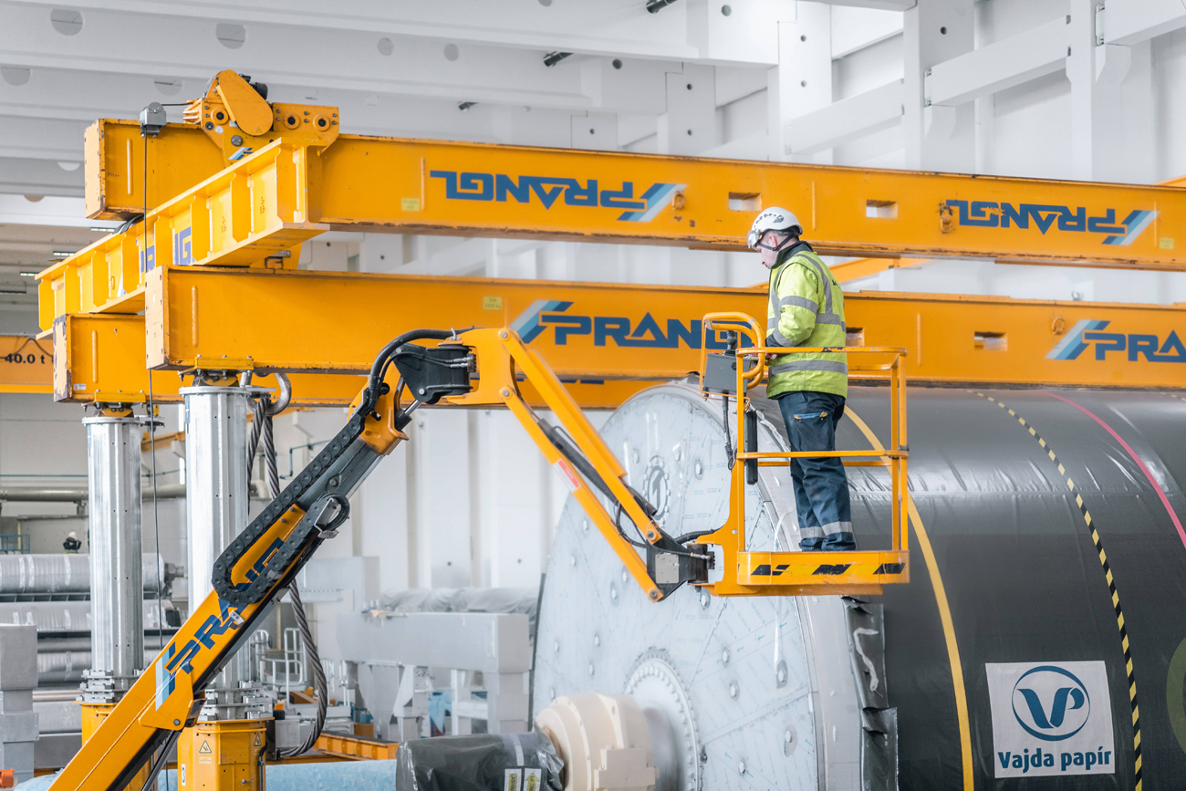 Für den Ausbau der Papierfabrik im ungarischen Dunaföldvár wurden Experten von Prangl hinzugezogen. Der 145 Tonnen schwere Yankee-Papiertrockenzylinder musste in die Halle gebracht und „gezogen“ werden – im wahrsten Sinne des Wortes, da aufgrund der vorbereiteten Installationen wenig Platz war.