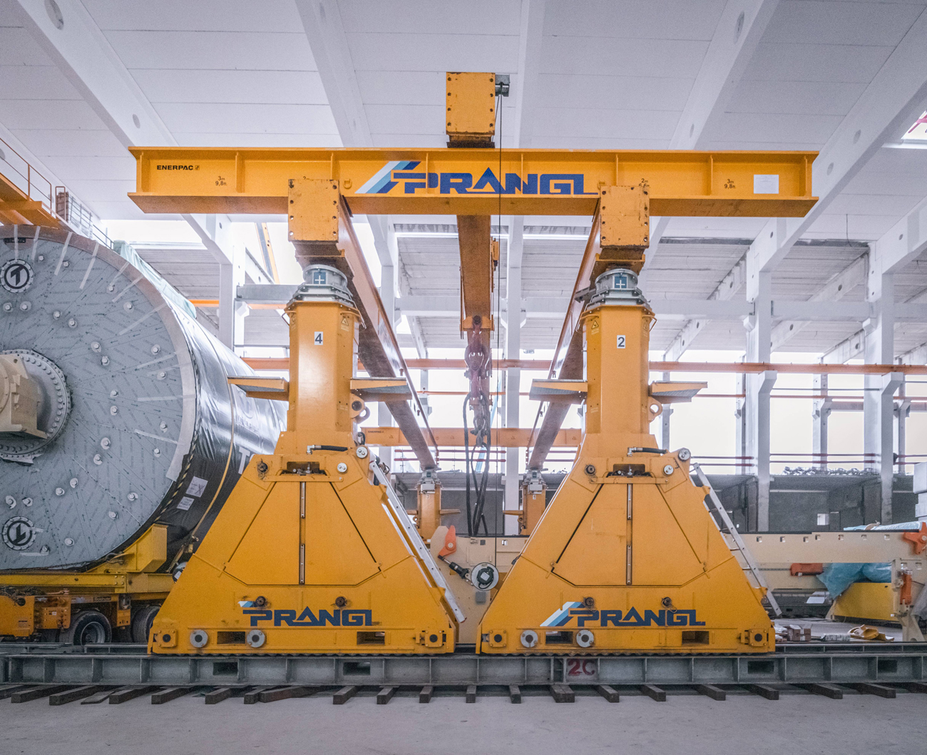 Der mächtige Yankee-Zylinder (5,70 Meter hoch, 5,50 Meter breit und 9,20 Meter lang) wurde mit einem 6-achsigen Selbstfahrer vorsichtig in die neue Produktionshalle eingefahren und quer unter dem Hubportal positioniert. Um genügend Platz zwischen den Schienen zu haben, musste sogar das Antriebsaggregat des Selbstfahrers abgebaut werden. Danach konnte das Hubportal das Trocknungsgerät übernehmen. Aber damit war die Aufgabe noch nicht erledigt, durch die ungarischen Behörden musste vor Ort noch eine vorgeschriebene Druckprobe durchgeführt werden.
