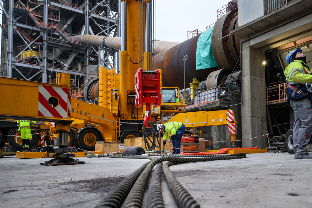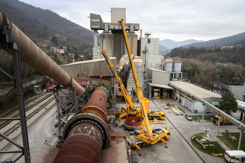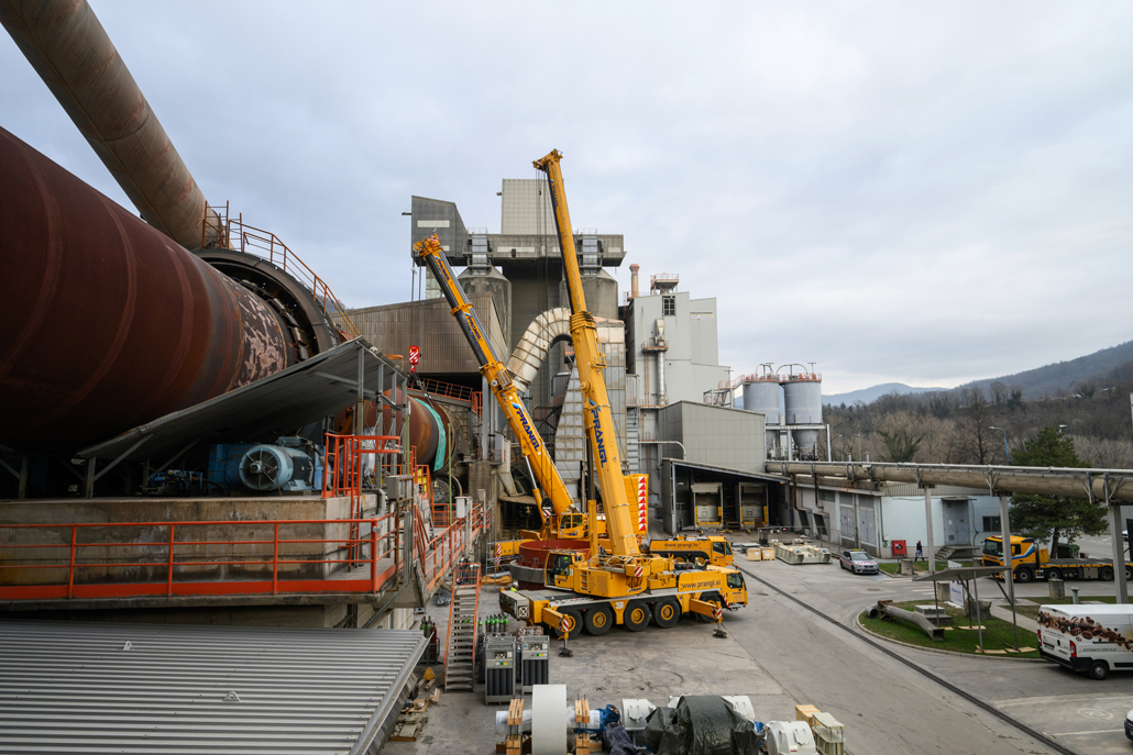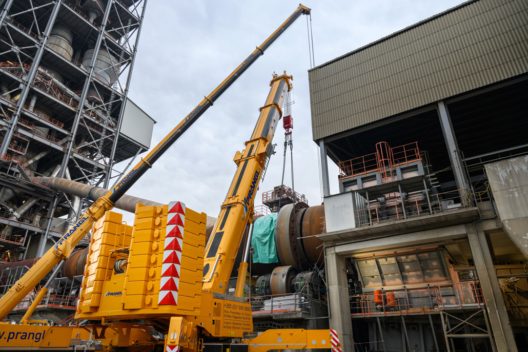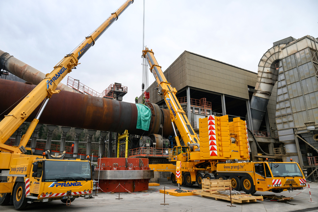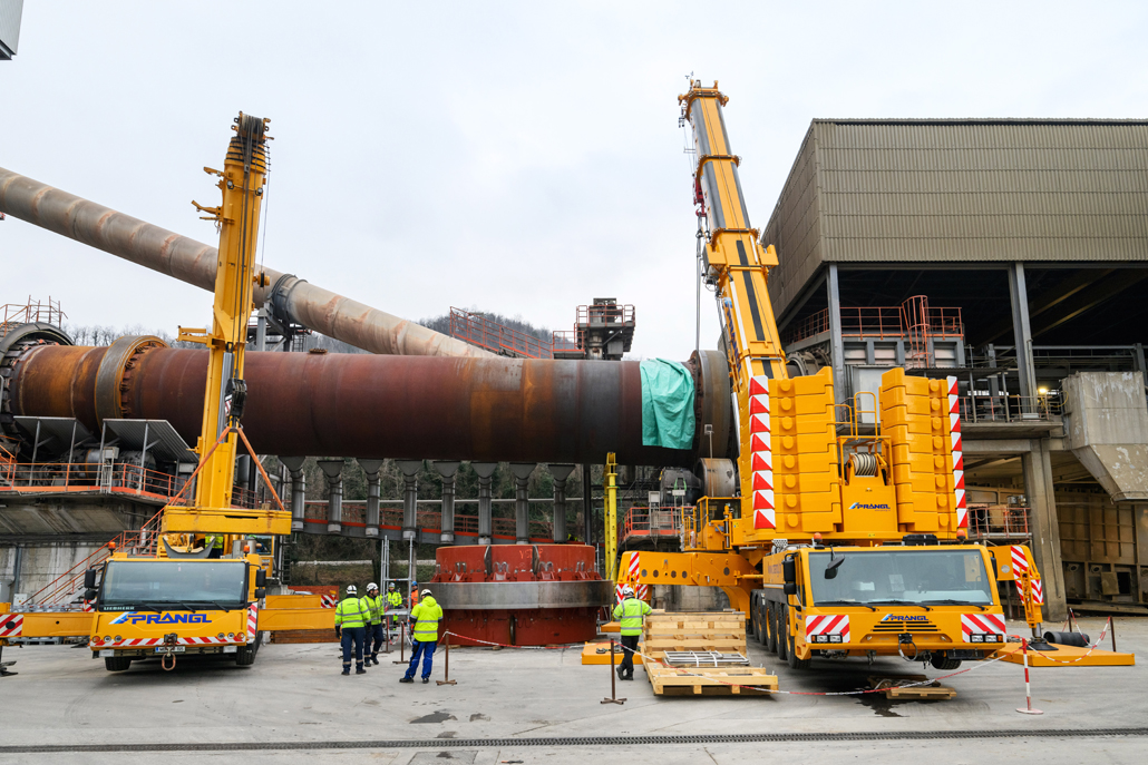 Der Auftraggeber für die Wartungsarbeiten in einem Zementwerk (Es ist das einzige in Slowenien und der größte Arbeitgeber im zentralen Soča-Tal.) betraute die gelben Spezialisten mit der Durchführung. Die Betreuer von Prangl wählten nach einer akribischen Studie den neuen 500 Tonnen Mobilkran als Hauptakteur für diesen Einsatz. Als Hilfskran fungierte ein 160 Tonnen Teleskopkran. Während der heiklen Arbeiten am Drehrohrofen wurde die Produktion selbstverständlich eingestellt. Bevor die Hübe überhaupt stattfinden konnten, musste zunächst der Rohrteil mit dem alten Stützrad durchtrennt werden.