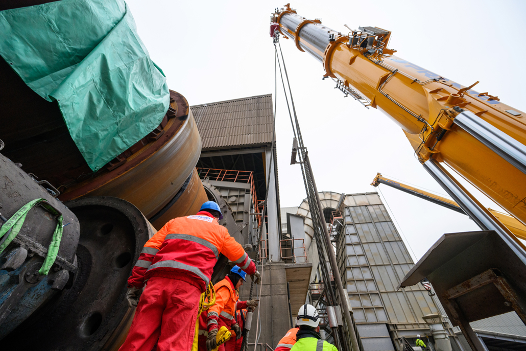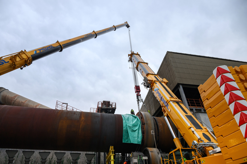 Die beiden Teleskopkrane wurden so neben dem Rohr platziert, dass sie ihre Aufgabe optimal erfüllen konnten. Der zuvor freigeschnittene Teil wurde vom 500 Tonnen Mobilkran herausgehoben. Von mehreren Männern zusätzlich mit Seilen an dem angrenzenden Gebäude vorbei in die richtige Position gebracht, konnte die Last vom 500 Tonnen Kran abgestellt und danach mit Hilfe des 160 Tonnen Krans im Tandemhub gedreht und in die Horizontale gebracht werden. Im nächsten Arbeitsschritt wurde der alte 80-Tonnen-Antrieb zusammen mit zwei Motoren heruntergehoben. Danach kam der neue Antrieb an die Reihe.