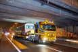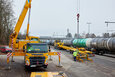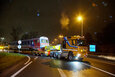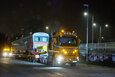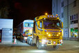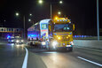 Um 22:00 Uhr setzte sich dann der Schwertransport mit einer Gesamtlänge von 36,50 Meter, einer Gesamtbreite von 3,80 Meter, einer Höhe von 4,60 Meter und einem Gesamtgewicht von 129,10 Tonnen in Bewegung. Die erste Hürde war die direkt neben dem Stadthafen liegende Auffahrt auf die Mühlkreisautobahn, die für dieses Vorhaben sogar kurzfristig gesperrt werden musste. Denn der Transportzug benötigte zur Einfahrt nicht nur die gesamte Breite der Autobahn: Nach kurzer Fahrt wurde vor einer Brücke gestoppt, der 9-Achser Zentimeter für Zentimeter abgesenkt und die Brücke im Schritttempo durchfahren. Auch die Ausfahrt nach der Donaubrücke forderte die Konzentration des LKW-Fahrers, die Kurve war nur ganz langsamen zu absolvieren.