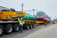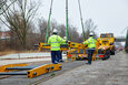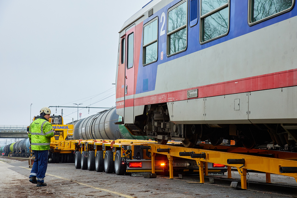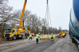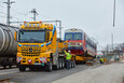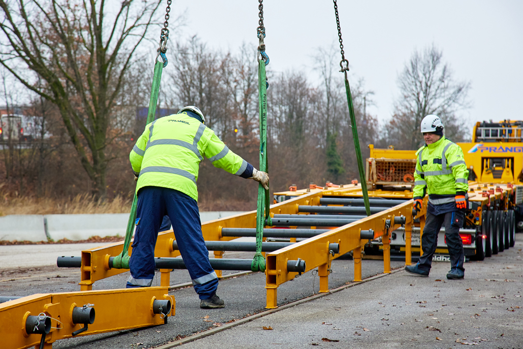 Prangl hatte auch in diesem Fall eine Lösung anzubieten: den Transport auf der Straße mit einer 4-Achs-Schwerlastzumaschine samt speziellem 9-achsigen Schienenfahrzeug-Transporter. Die Arbeiten starteten zur Mittagszeit: Um den Zug vom Schienensystem auf den Transporter verladen zu können, ist eine aus mehreren Elementen bestehende spezielle Auffahrtrampe notwendig. Die Teile waren zuvor mit der 4-Achs-Zugmaschine angeliefert worden und standen am Stadthafen schon bereit. Ein Element nach dem anderen wurde mit einem 50 Tonnen Fahrzeugkran – wegen der Oberleitung mit Hub- und Drehbegrenzung – versetzt und von den Prangl-Mitarbeitern montiert.