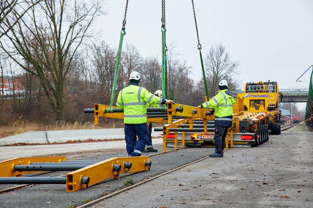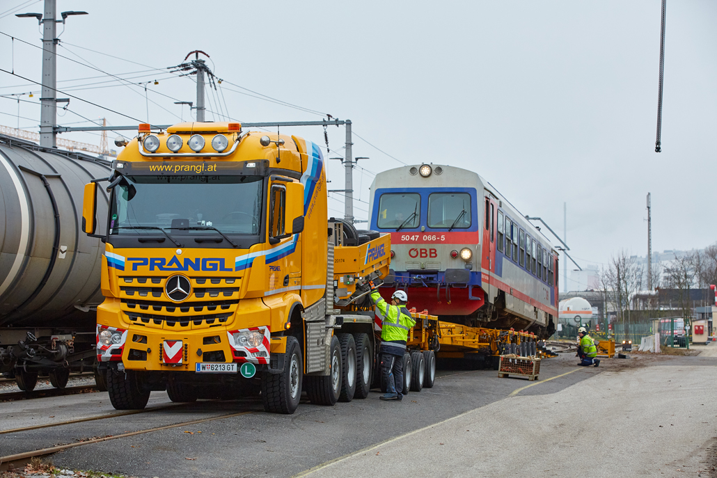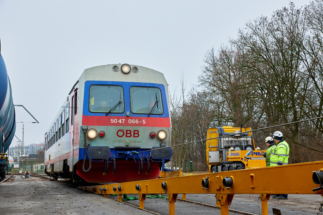 Ein 58 Tonnen schwerer Triebwagen der ÖBB sollte vom Linzer Stadthafen zum Mühlkreisbahnhof Linz Urfahr verlegt werden. Doch wie soll das gehen, wenn es zwischen den beiden Bahnhöfen keinerlei Schienenverbindung gibt? Eine Herausforderung, die ein Spezialist wie Prangl nur allzu gerne annimmt.