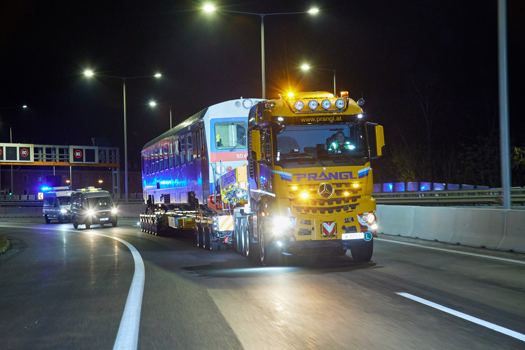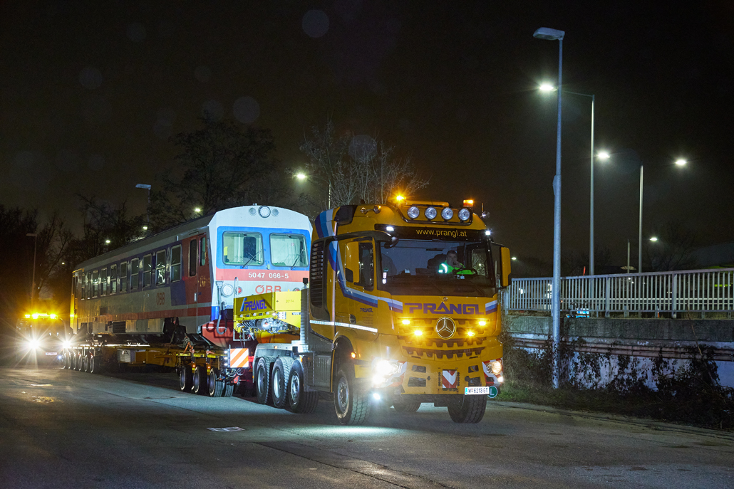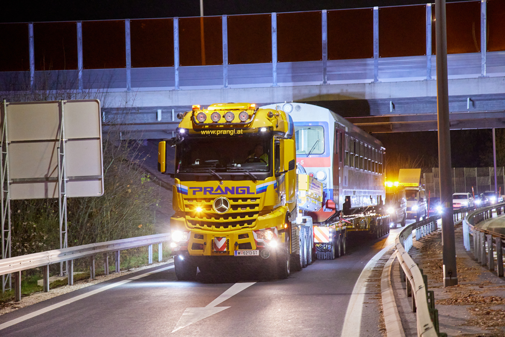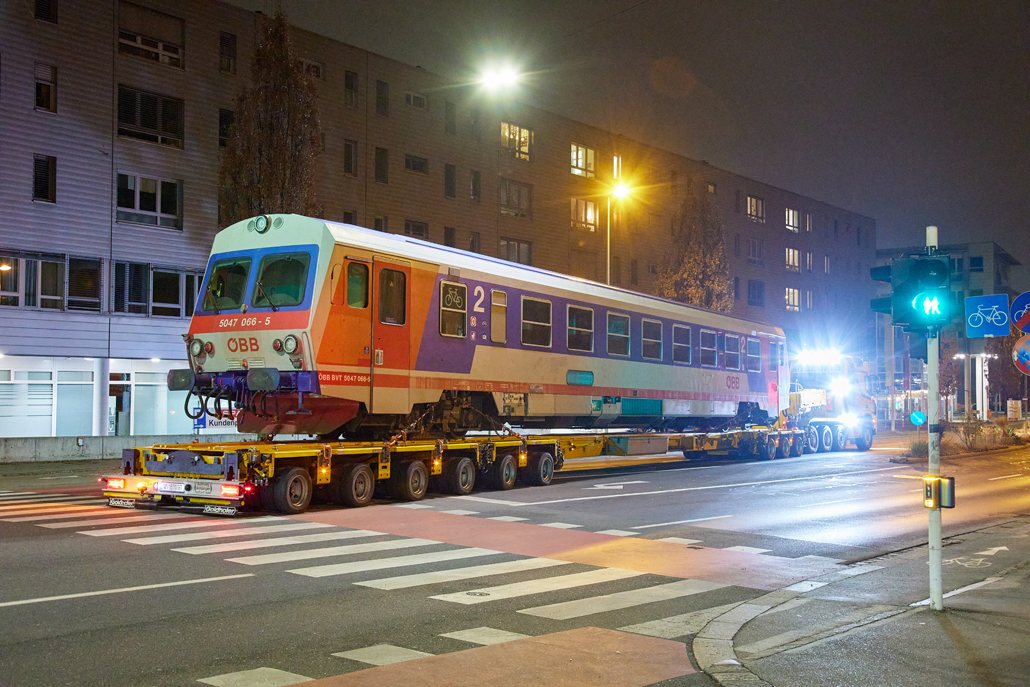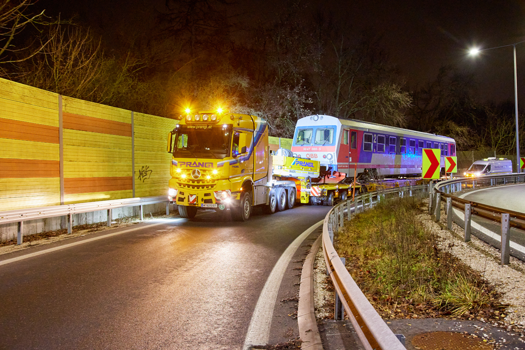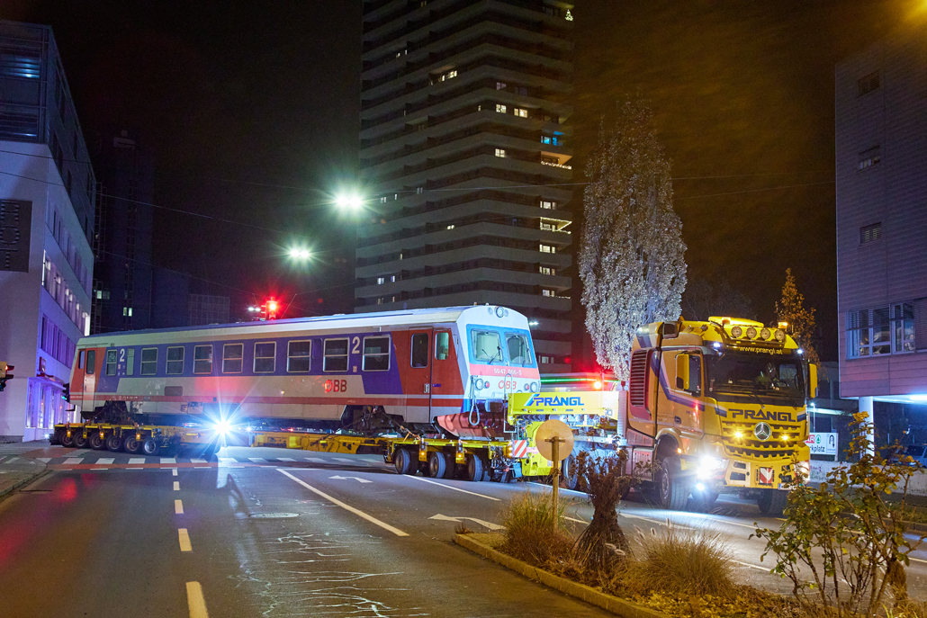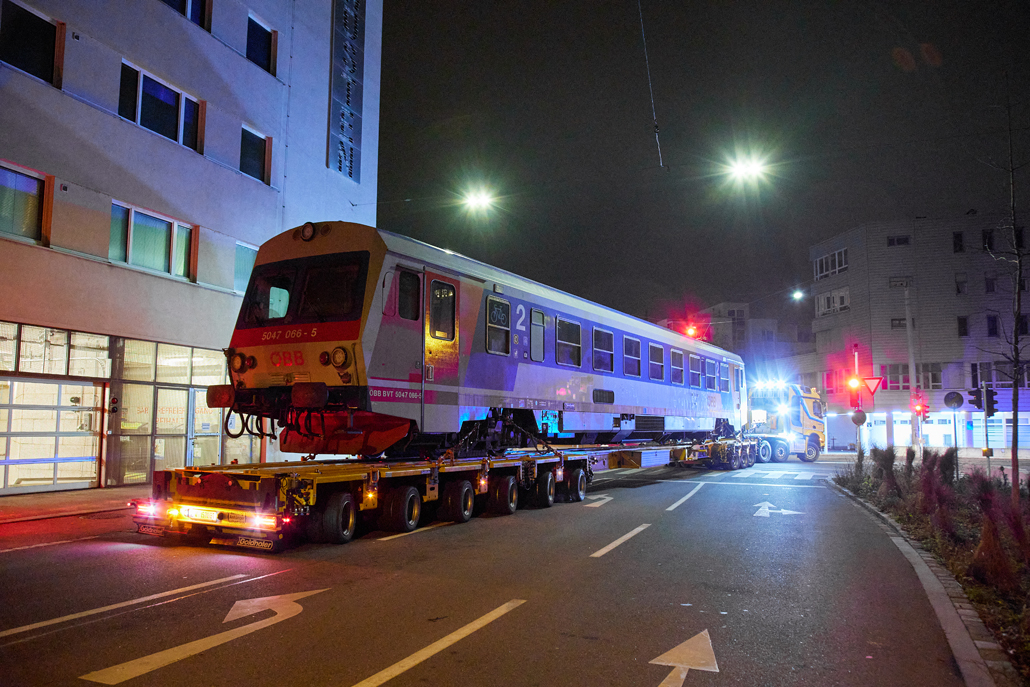 Der weitere Weg durch die nächtliche Innenstadt von Linz war wegen der beachtlichen Abmessungen des Transportes herausfordernd. Die Begleitfahrzeuge mussten immer wieder Straßenabschnitte sperren, um das sichere Passieren – oft auf der Gegenfahrbahn – zu ermöglichen. Das allerletzte Teilstück war dann die heikelste Aufgabe. Denn um den Triebwagen wieder auf die Bahnschienen zu bringen, musste der Fahrer des überlangen Transporters die rund 320 Meter lange Straße im Rückwärtsgang bewältigen. Dies gelang souverän und so konnte der Zug am Zielort über die vorbereitete Auffahrtrampe wieder abgeladen werden.