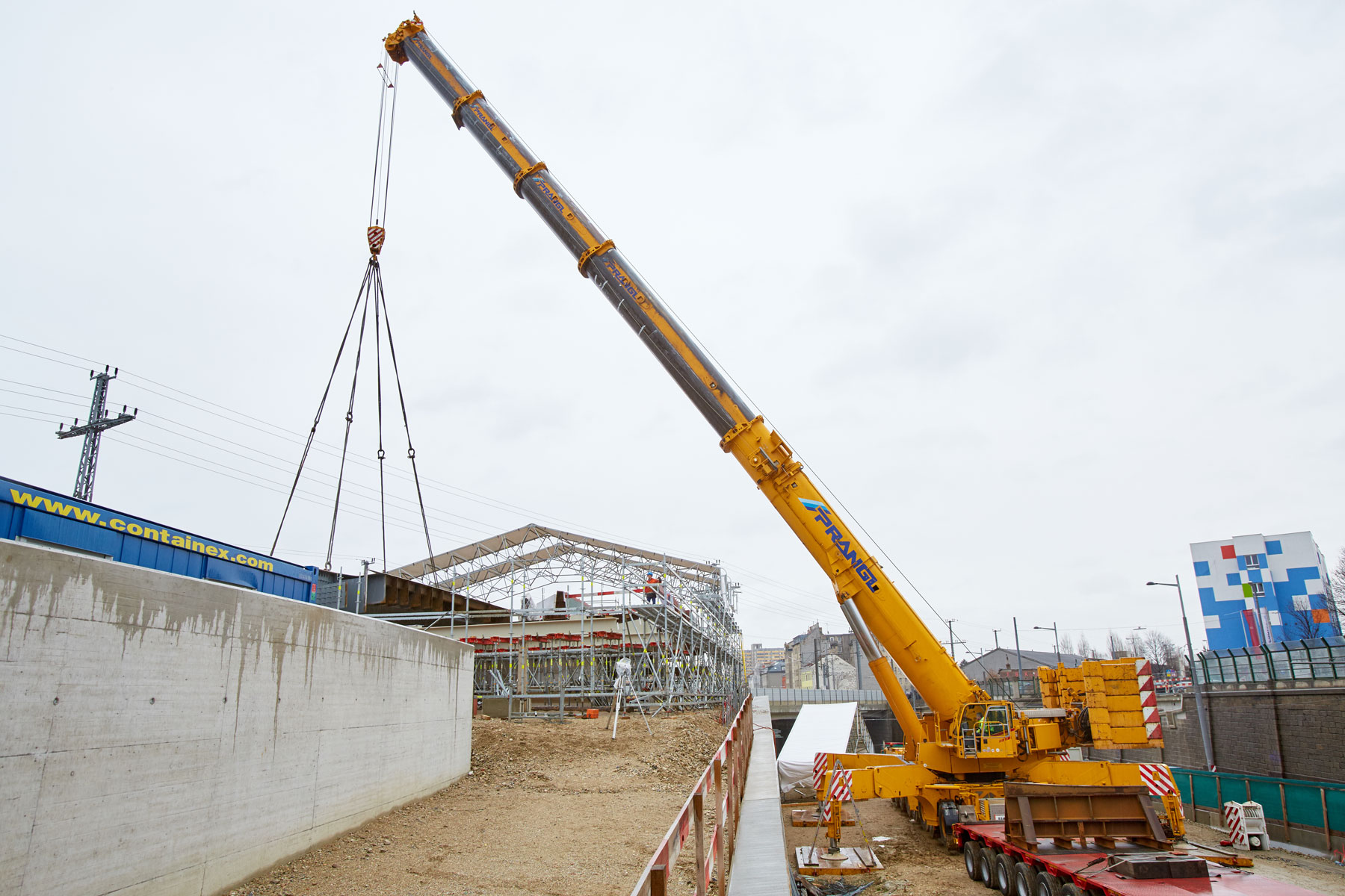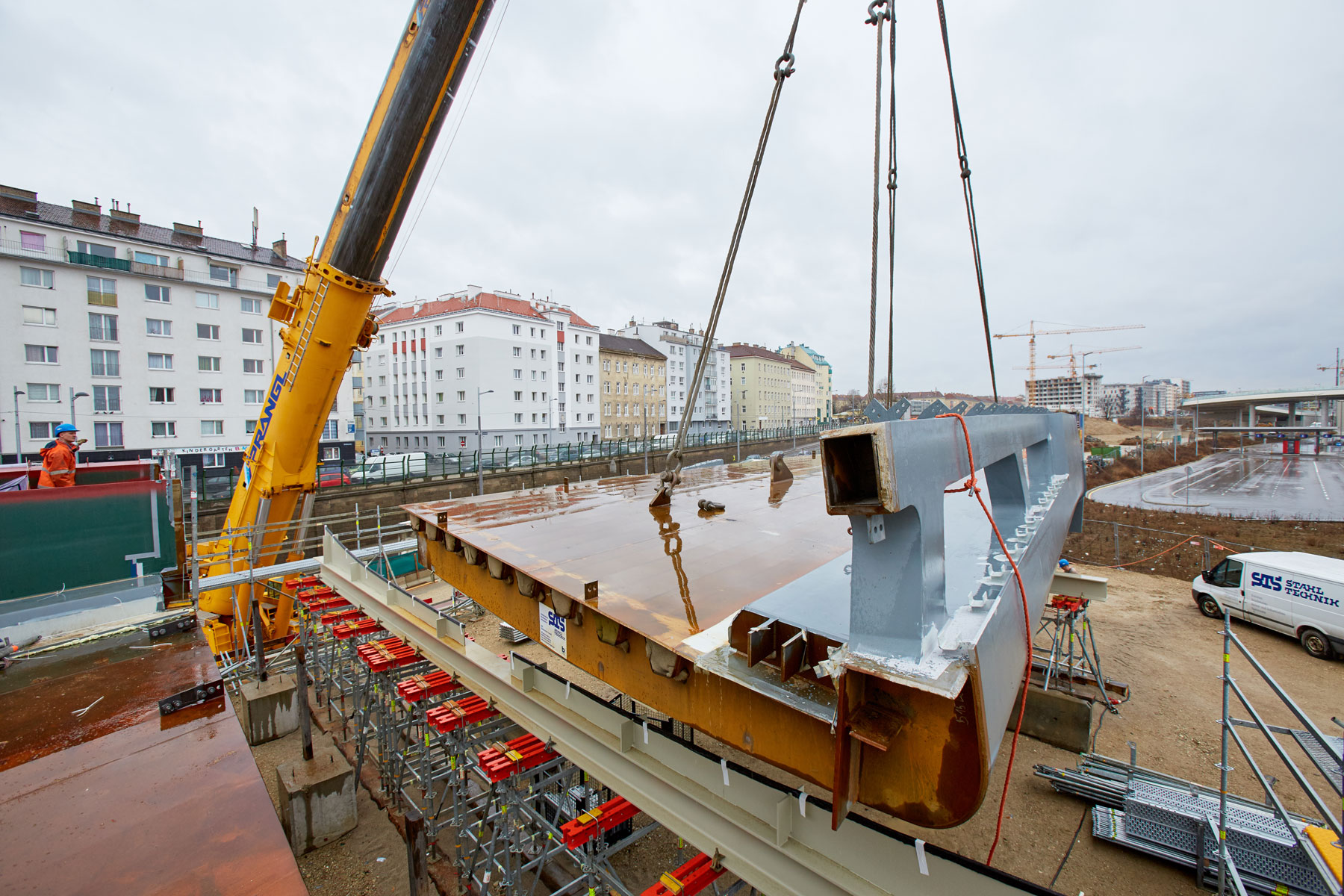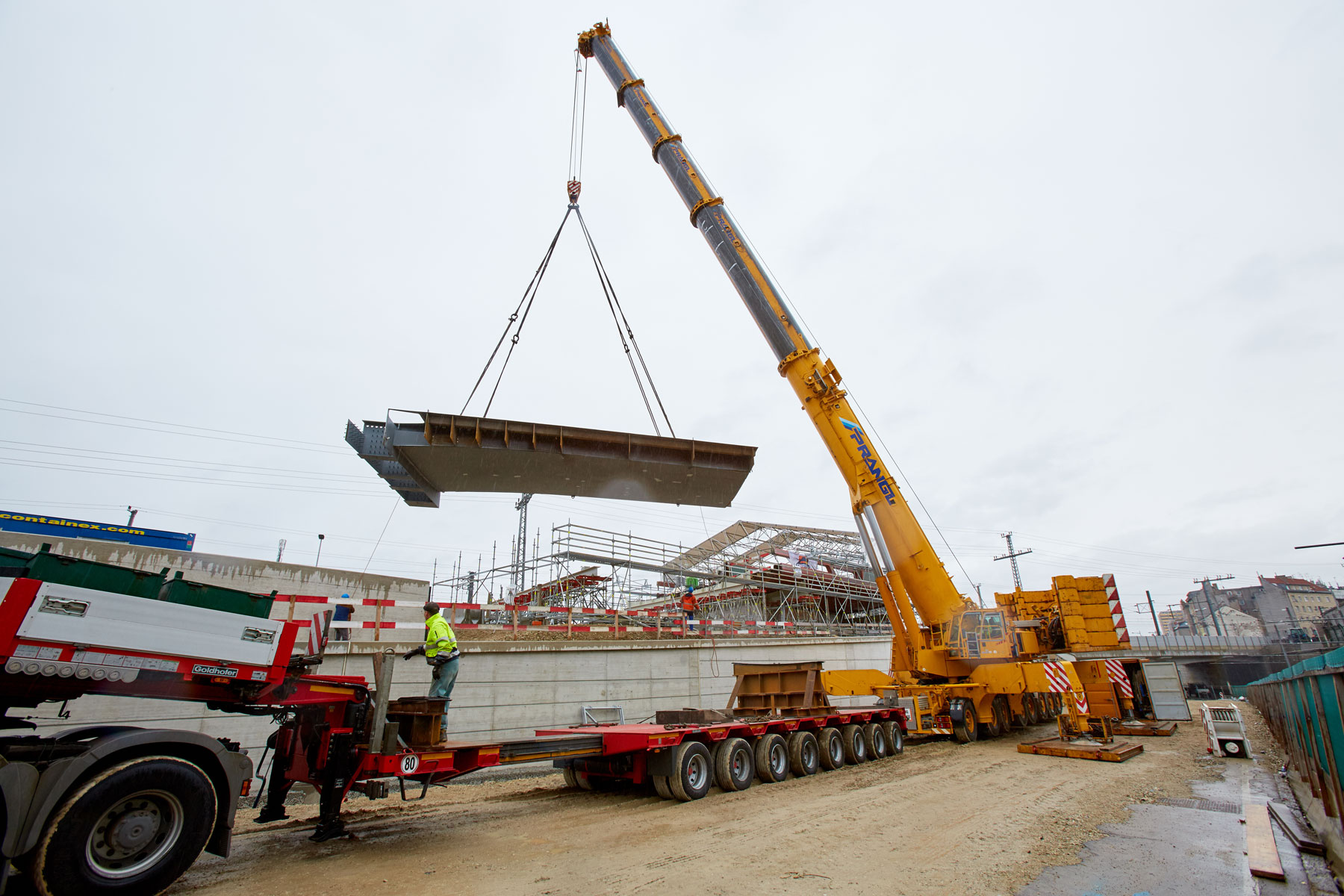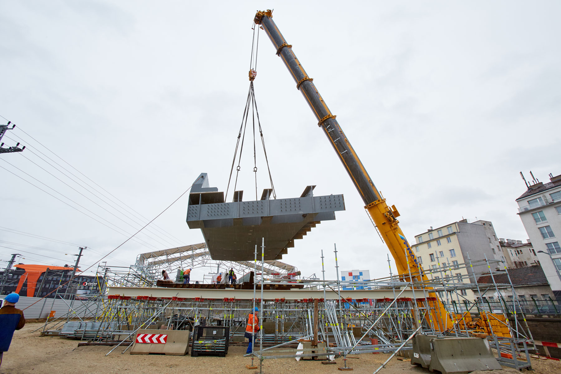 Die Kempelenbrücke und der Hüttenbrennersteg verbinden den Wiener Hauptbahnhof mit der Gudrunstraße. Die größere von beiden, die Kempelenbrücke besteht aus vier Teilen, die aus Deutschland angeliefert wurden. Bei der Montage der Brücke kam Prangl ins Spiel – schließlich ist das Unternehmen Meister in Sachen “schwere Lasten heben“.