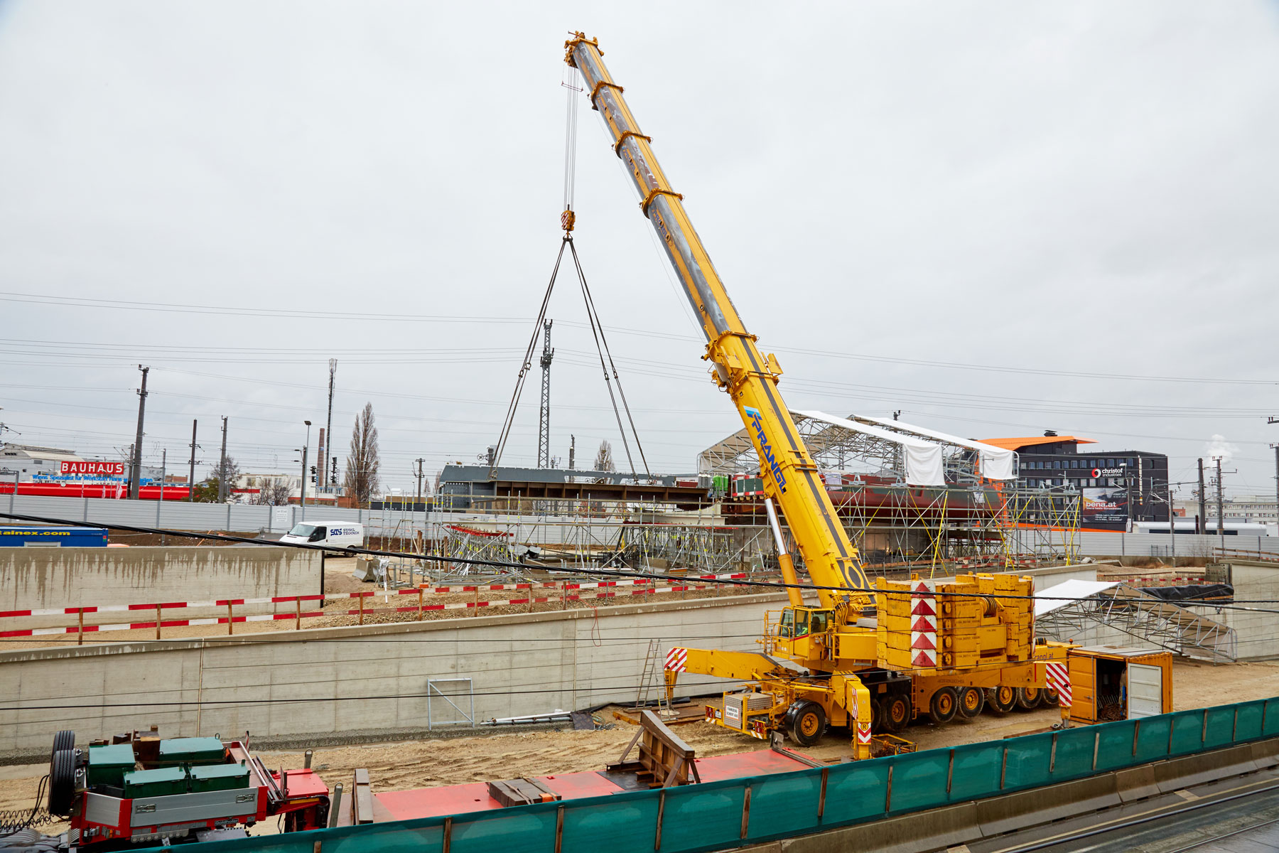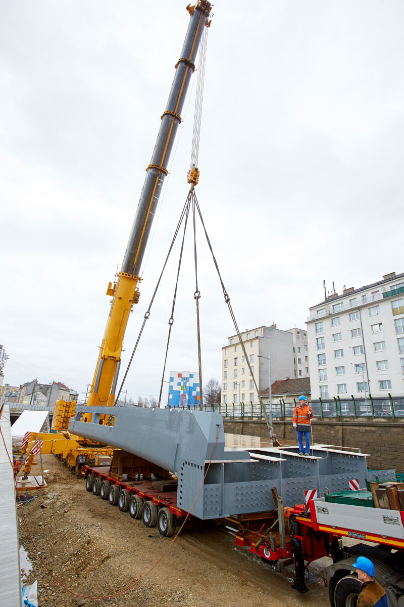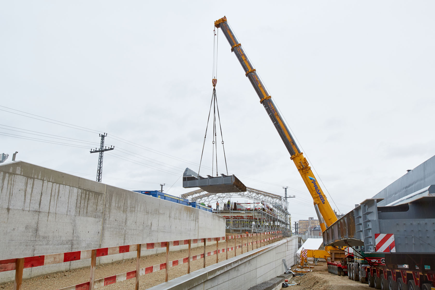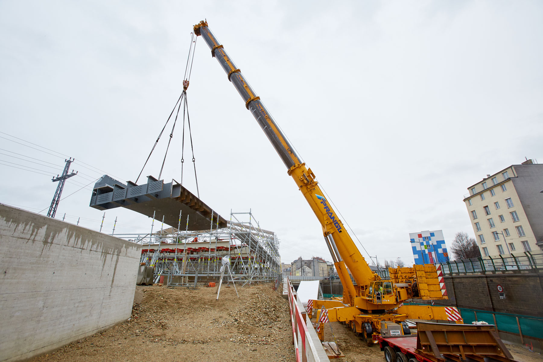 Die Kempelenbrücke und der Hüttenbrennersteg verbinden den Wiener Hauptbahnhof mit der Gudrunstraße. Die größere von beiden, die Kempelenbrücke besteht aus vier Teilen, die aus Deutschland angeliefert wurden. Bei der Montage der Brücke kam Prangl ins Spiel – schließlich ist das Unternehmen Meister in Sachen “schwere Lasten heben“.