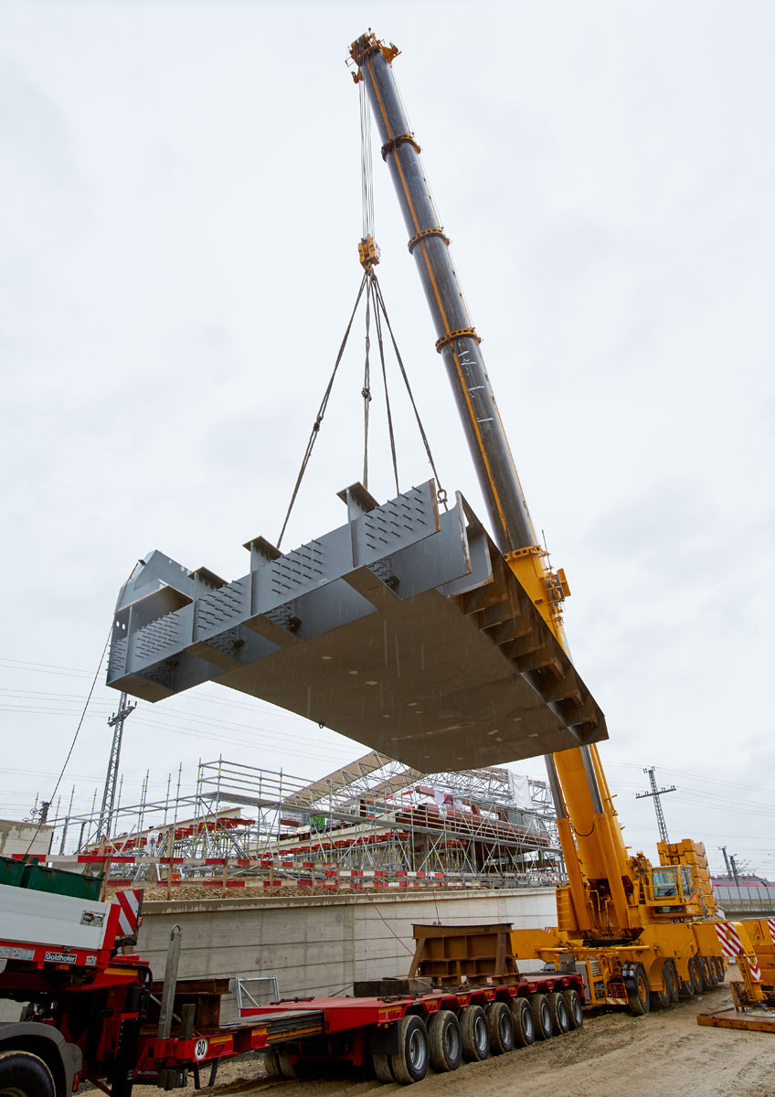 Ähnliches ist auch der Vorgang beim Hüttenbrennersteg, dieser folgt noch. Bei dieser, kleineren Brücke werden nur zwei Segmente à 55 Tonnen auf die vorbereiteten Gerüstteile gehoben. Danach erfolgt abermals die genaue Vermessung und Verschweißung zu einem Tragwerk. Die genaue Vorplanung und Hebestudie erlaubte ein Konzept, das nur eine Krantype vorsah. Das wiederum führte zu einem kostenoptimierten Projektablauf.